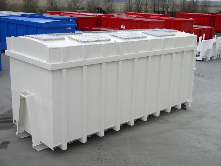 Cette benne agricole est conçue pour transporter et stocker des matériaux sensibles comme des poudres ou des poussières.
