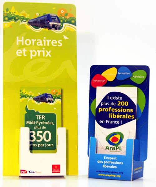 Nous recherchons un présentoir PLV de comptoir en carton, à poser sur une borne ou une étagère de pharmacie, dans un format et un esprit proches de PLV comptoir A4, comme les modèles classiques utilisés en officine (présentoirs carton compacts, autoportants).