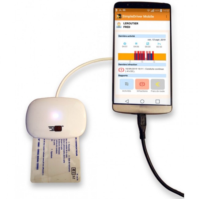 Je suis chauffeur dans une entreprise. Je souhaite pouvoir vider ma carte conducteur et pouvoir, consulter, archiver et imprimer mes activités enregistrées sur la carte (Sur PC et éventuellement sur smartphone). Je possède déjà un lecteur avec port USB A qui lit cette carte conducteur.