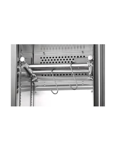 Avec ses grilles réglables et ses crochets de boucher, l'armoire s'adapte à différentes tailles et formes de morceaux de viande. La barre de suspension robuste permet de maximiser l'espace.