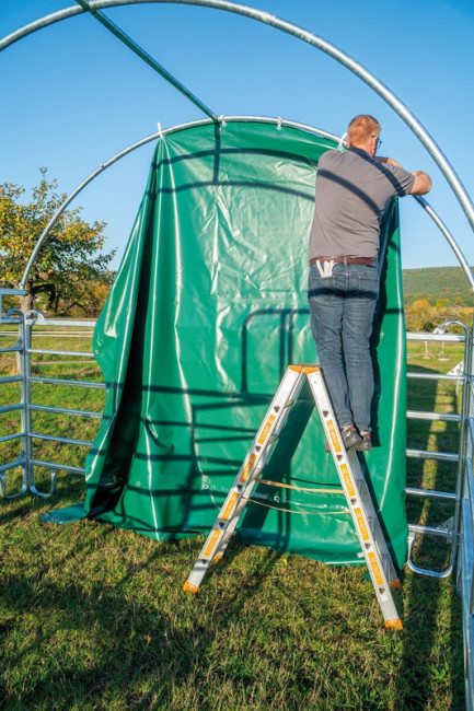 Pour une protection maximale, des bâches ou des filets brise-vent avec œillets sont disponibles pour les côtés et le pignon, offrant une résistance accrue aux intempéries.