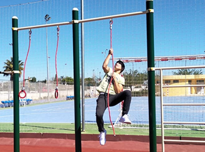 Cette barre de street workout avec corde à grimper permet de travailler les muscles de la poitrine, des bras et du dos.