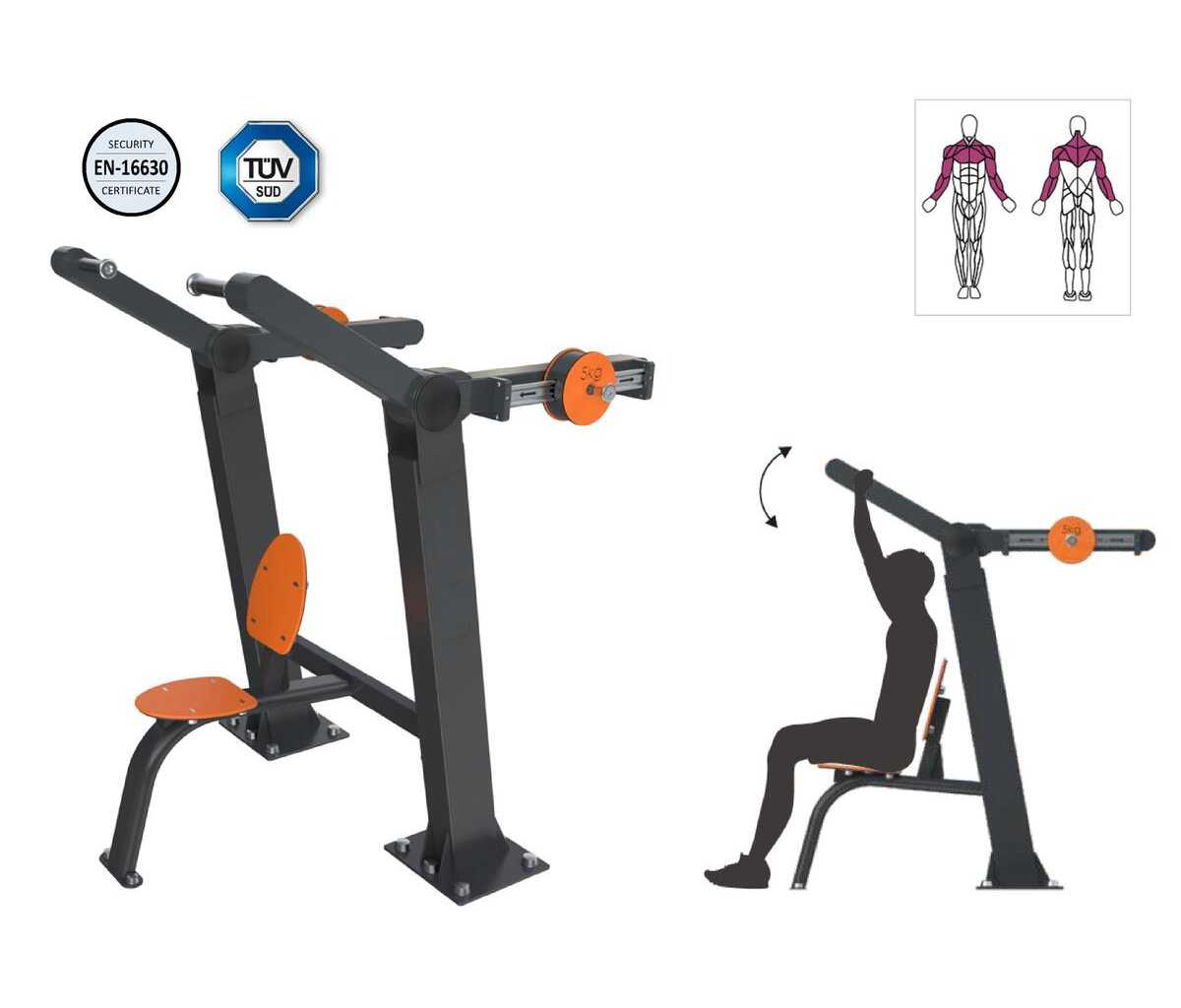Tous les équipements de fitness en plein air sont conformes à la certification TÜV et à la norme EN16630:2015, qui vérifie les aspects de la conception, de la fabrication, des finitions et de la sécurité.