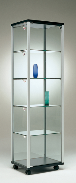Vitrine d'exposition classique étroite en différents coloris est proposé par un groupe qui commercialise tout type de vitrine et matériel d'exposition créé en 2008, après 18 ans d'expérience professionnelle dans les métiers du verre.