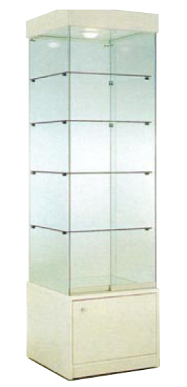 Vitrine avec 4 étagères en verre, meuble de base et plafond en mélaminé, éclairage 1 spot.