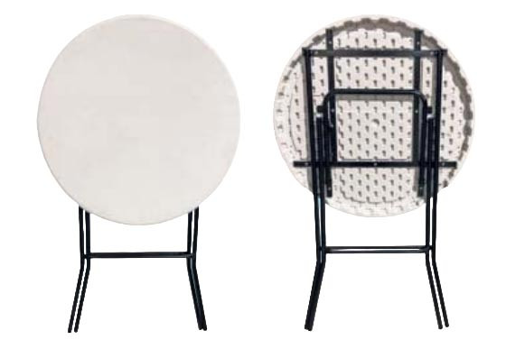 Cette table haute de réception pliante est constituée d’un plateau en polyéthylène gris clair de 800 mm de diamètre et 45 mm d’épaisseur.