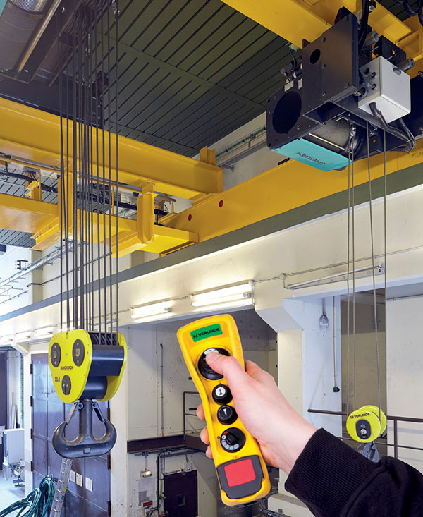 - Applications : contrôle de l’ensemble des mouvements avec une main pour le fonctionnement d’un pont roulant, d’un palan électrique solo, d’un palan avec chariot de direction motorisé (monorail) ou sur une potence (rotation électrique).