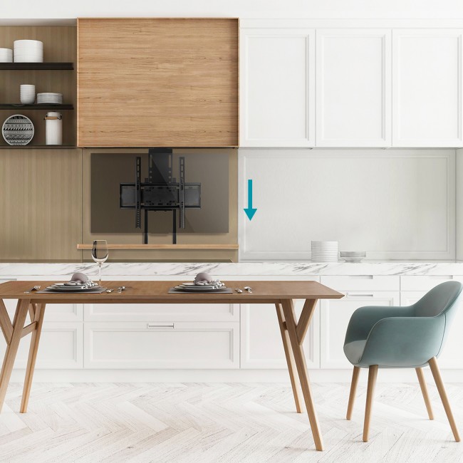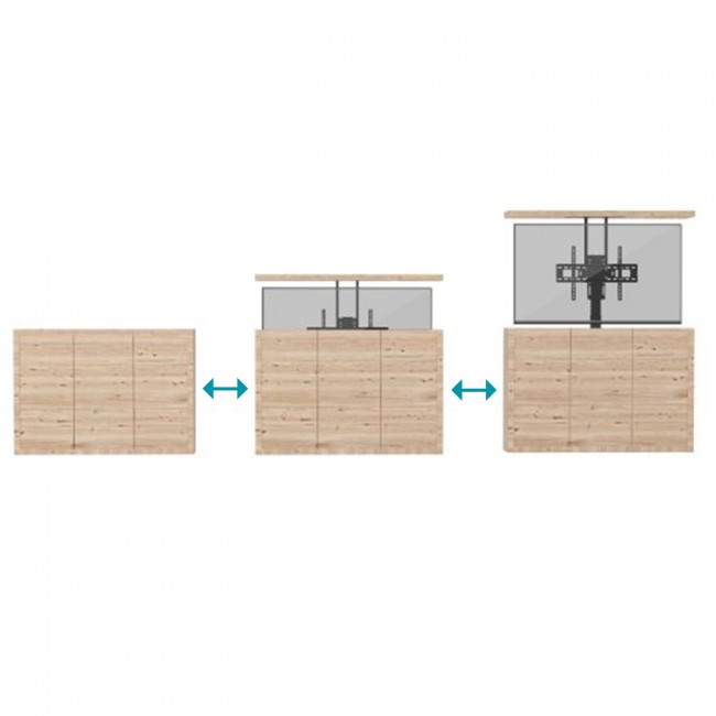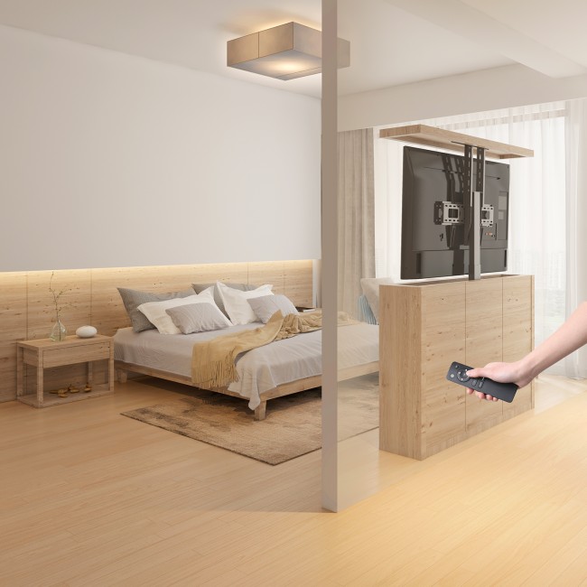 Conçu comme une solution moderne d'intégration novatrice, ce support élévateur est destiné à être installé, au sol ou au plafond, dans un meuble pour faire sortir votre téléviseur et le ranger après utilisation grâce à sa télécommande.
