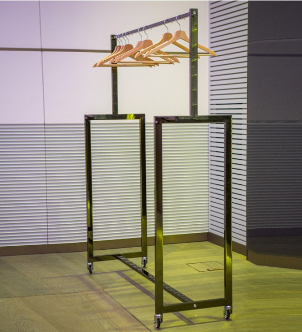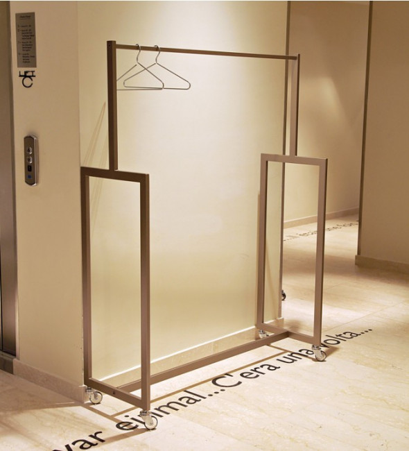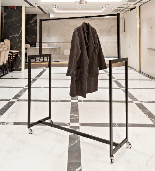 Barre porte-manteau sur roulettes utilisé pour suspendre des vêtements tels que des manteaux, des vestes, des chapeaux et des sacs.