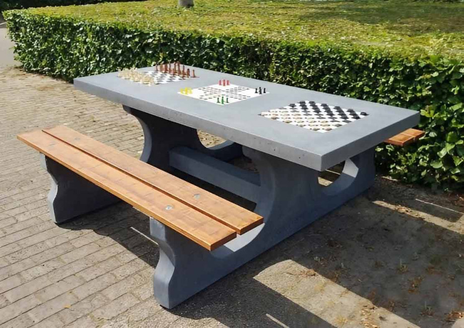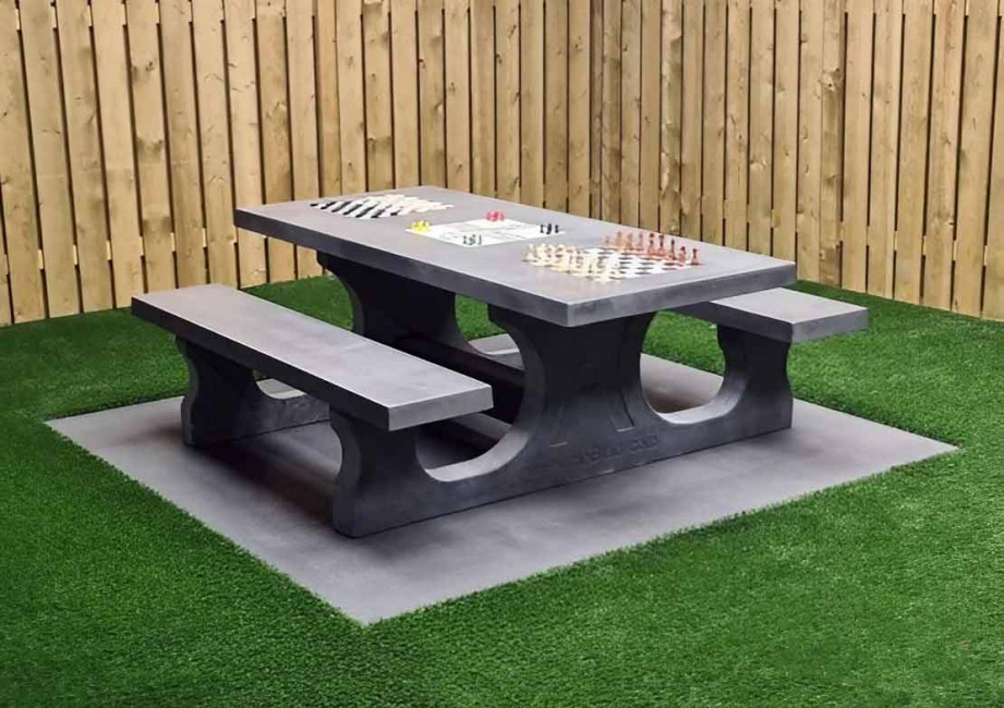 L’ensemble est composé d’une table, de 2 places assises pour au moins six personnes et trois jeux différents. Les assises sont disponibles en béton ou en bambou résistant aux intempéries.