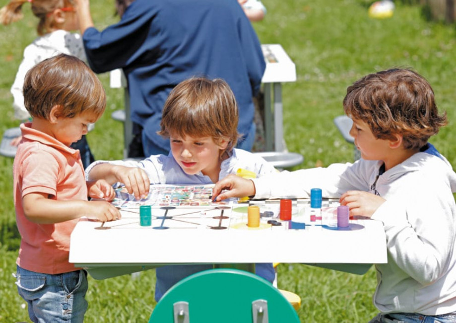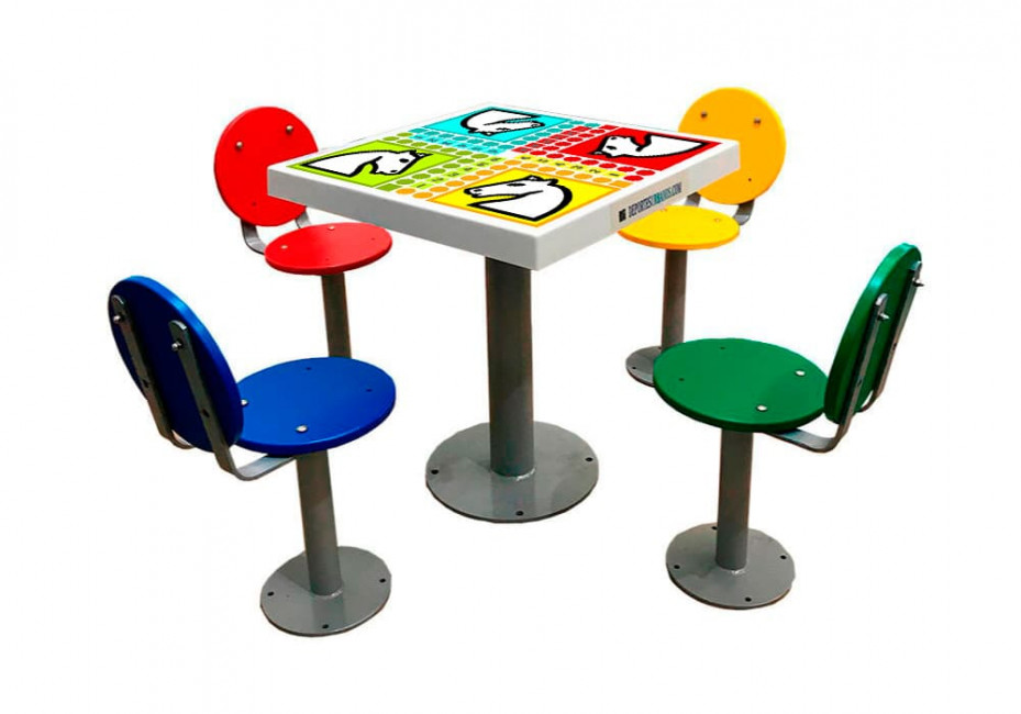 Table de jeux des petits cheveux pour extérieur, équipée de 4 sièges colorés avec dossier.