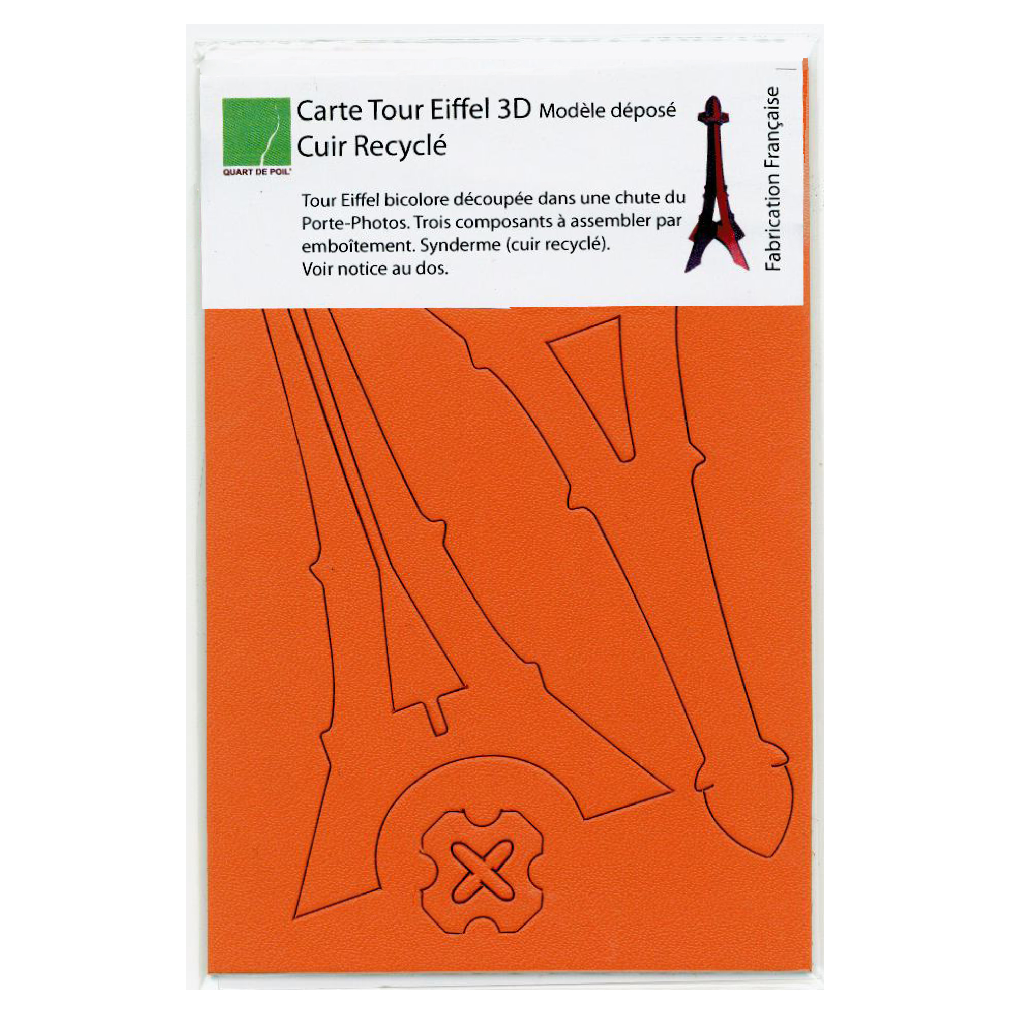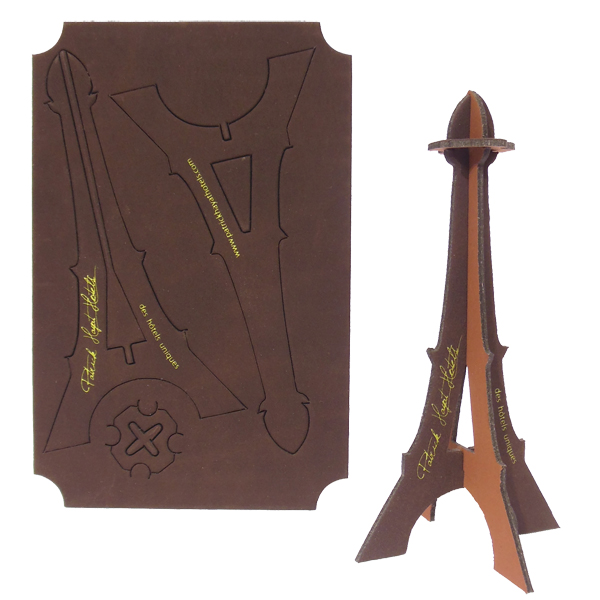 Carte de la Tour Eiffel en kit fabriquée à partir dun rectangle en cuir recyclé (70% à 80% de fibres provenant de la fabrication de chaussures).