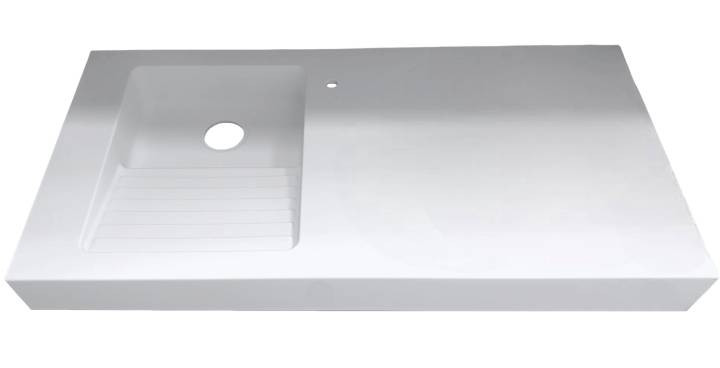 Le plan, la cuve et le dosseret arrière sont moulés en une seule pièce, empêchant les infiltrations d’eau et simplifiant l’entretien.