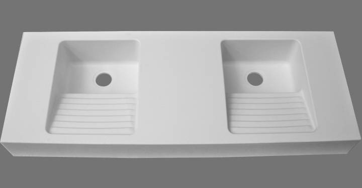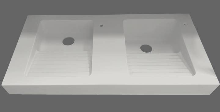 Plan simple ou double cuve Cuves centrées ou décentrées Avec ou sans trop-plein Trou de robinetterie sur plan ou en façade Hauteur du bandeau frontal jusqu’à 180 mm Coloris personnalisables Joues latérales de finition et angles à pan coupé.