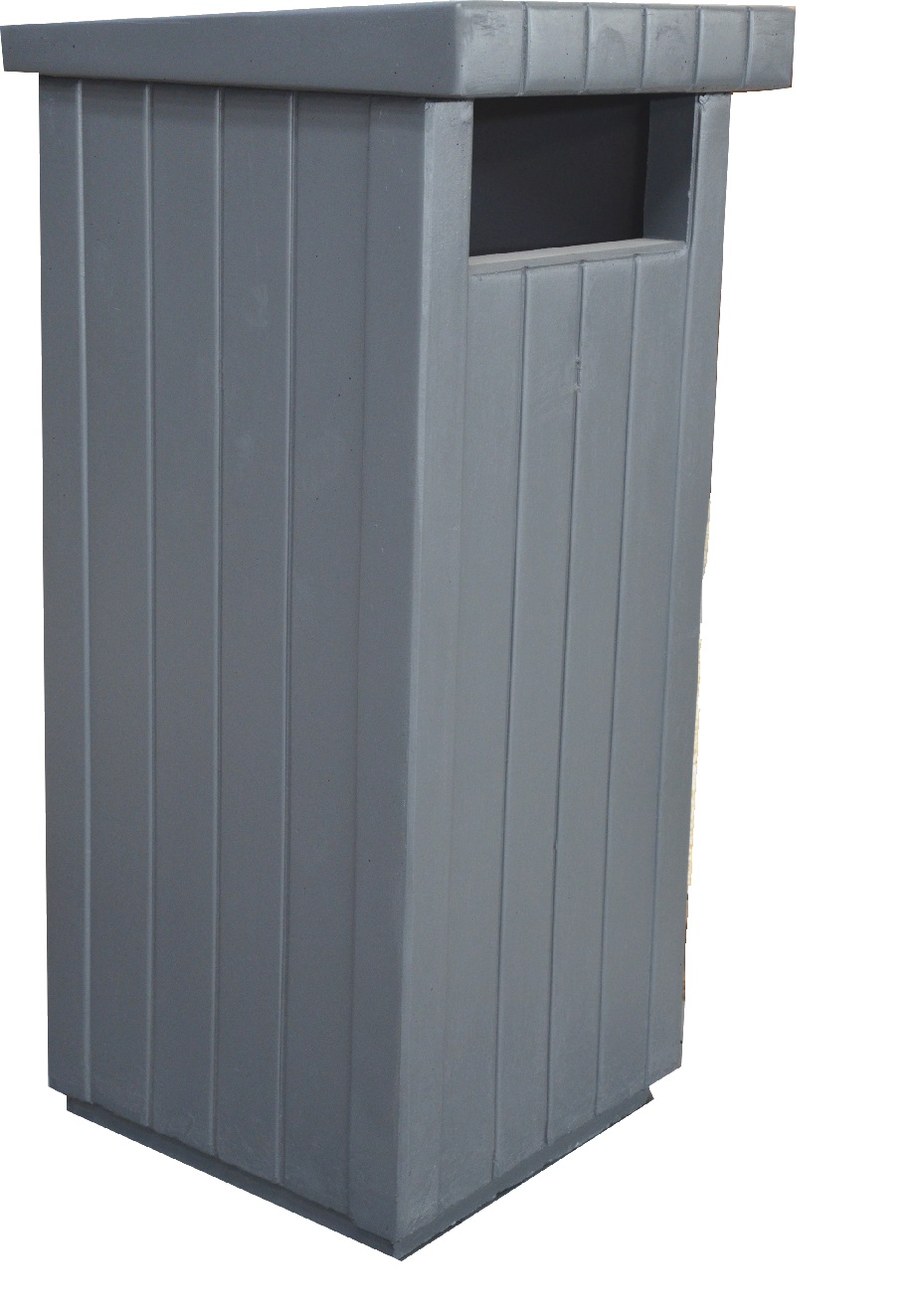 - Poubelle monobloc en béton gris teinté dans la masse, revêtu d'un traitement de protection teinté.
