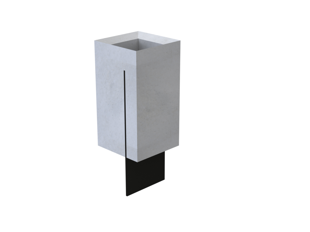Il s’agit d’une corbeille conçue comme un simple bloc en béton traversé par une lame d’acier.