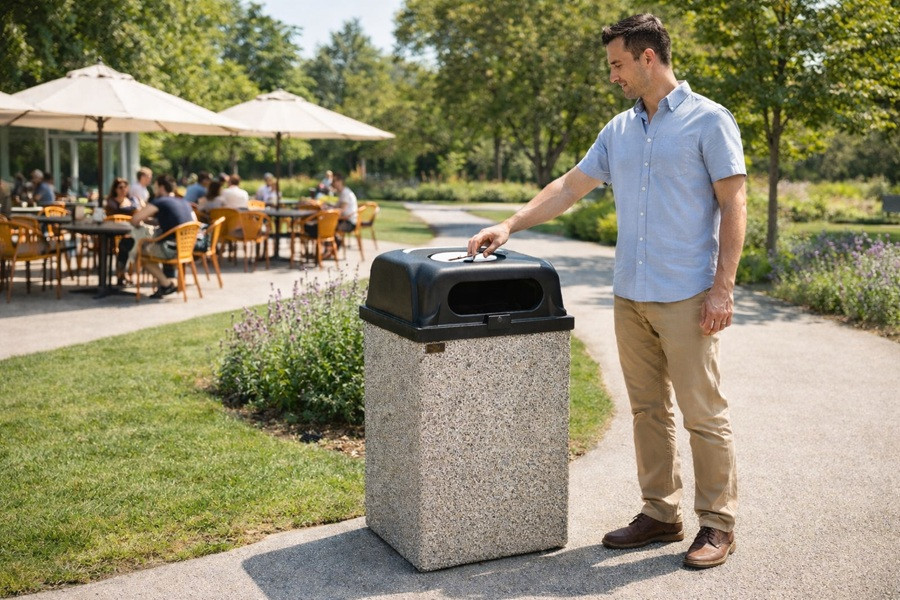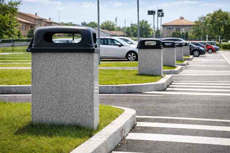 Notre corbeille de ville en béton est une borne de propreté carrée conçue pour répondre aux exigences élevées des :