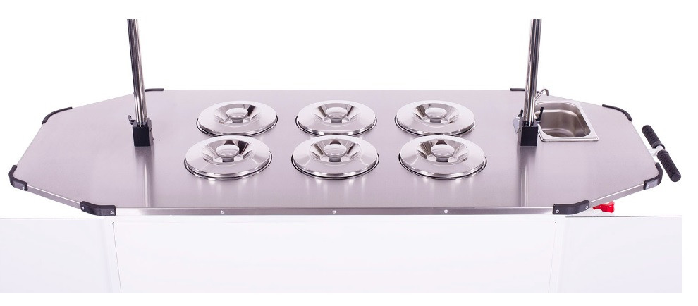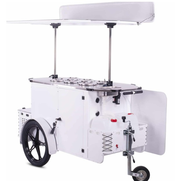 Besoin urgent Triporteur crème glacé Gelato personnalisé avec 6 bacs et un point d"eau avec réserve .Merci