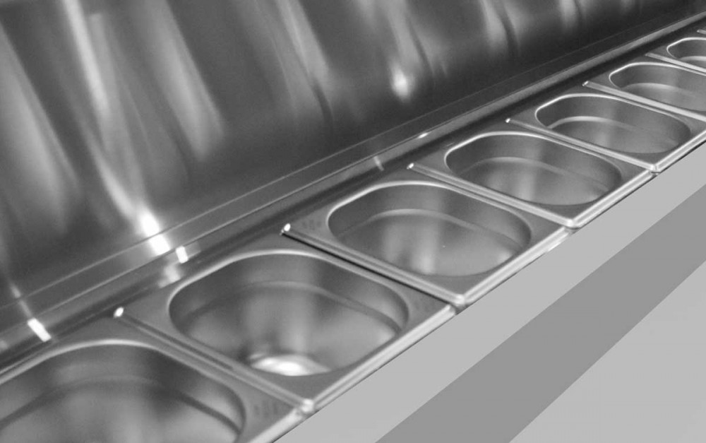 Elle permet de loger 7 bacs GN1/6 + 1 bac GN 1/9 pour recevoir les préparations : légumes, viandes, fromages, herbes...
