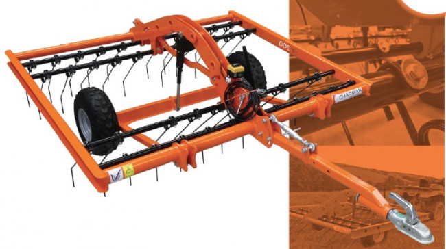 C'est une herse à dents traînée avec relevage électrique pour abaisser/ lever facilement les roues lorsque la herse est en cours d'utilisation.