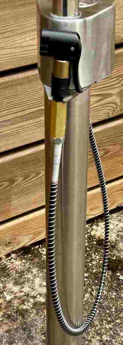 Elle est reliable à l’eau potable, tandis que le lavage vélo peut être raccordé à l’eau de pluie, garantissant une solution économique et écologique.