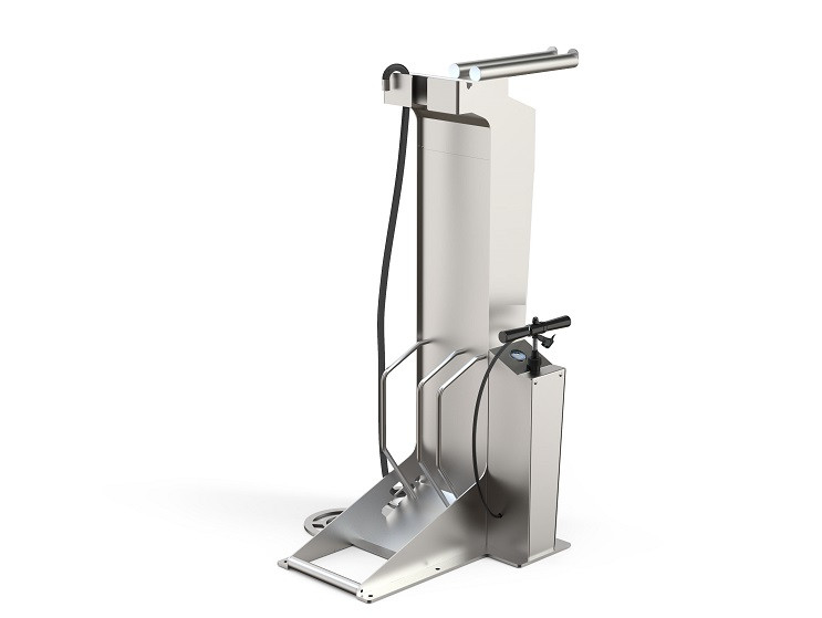 La station dispose d’un jet d’eau réglable de 2 à 4 bars, permettant de nettoyer efficacement le cadre, les roues et la chaîne.