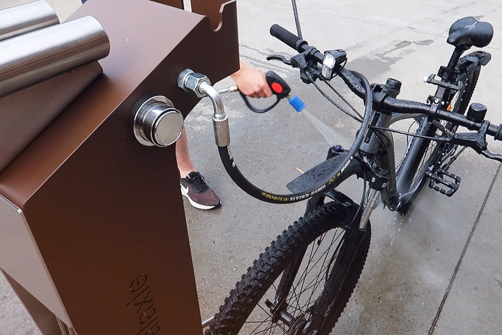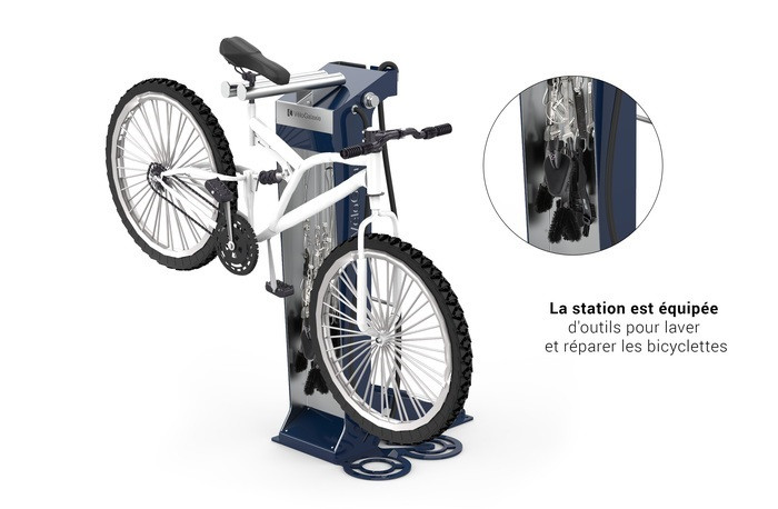 La station combine gonflage, réparation et lavage vélo, tout en respectant l’eau et l’environnement.