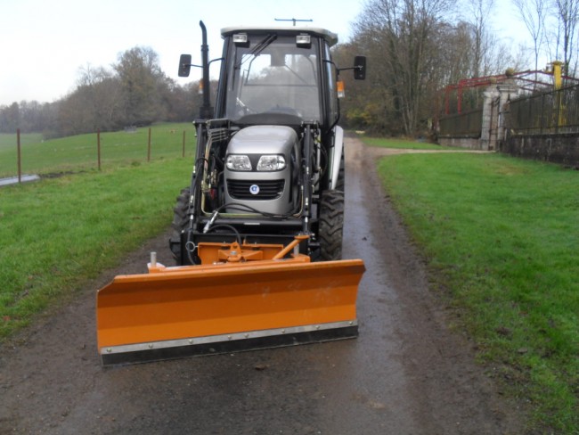 Il faut une lame de déneigement adaptable sur le relevage avant d"un tracteur agricole.