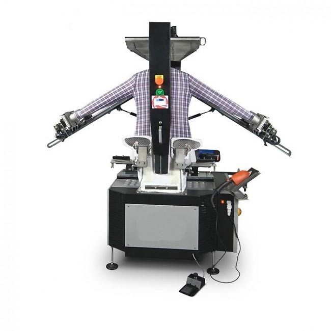 Il est conseillé de combiner le mannequin kite avec une presse col et poignet verticale, modèle SMART, pour configurer un poste de repassage de chemises compact et très productif.
