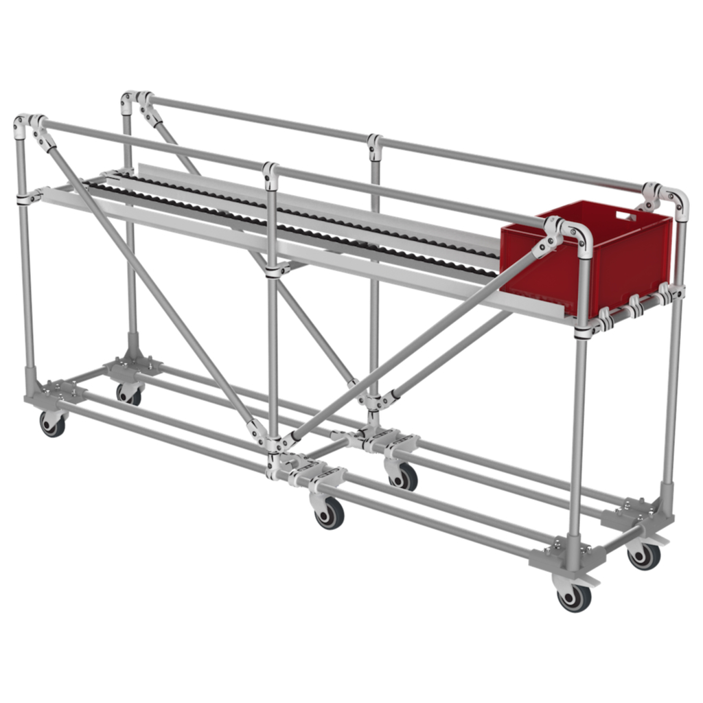 Les rails à galets équipants ce chariot sont montés avec des guides latéraux et des connecteurs avec butée qui permettent aux boîtes et aux cartons de rester bien en place lors du transport.
