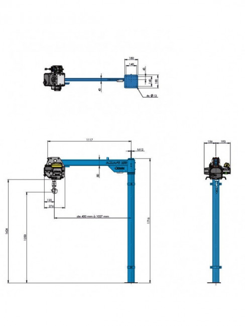 La hauteur du fût réglable de 1,70 mètre permet d'adapter la potence à la hauteur du véhicule et la longueur du bras de 1,10 mètre qui permet d'atteindre une portée suffisante pour déposer la charge au sol ou sur une autre surface.