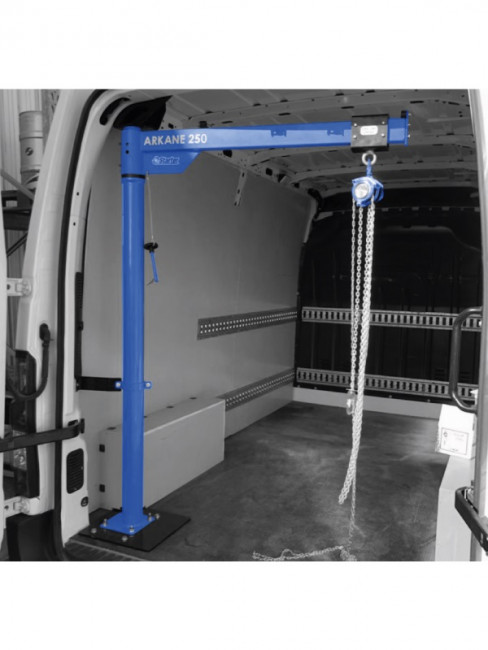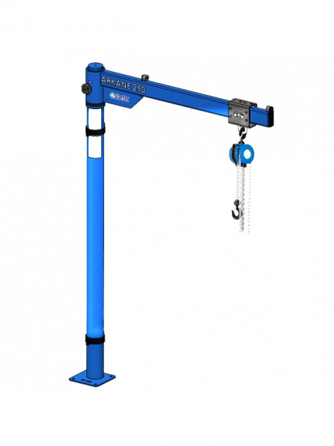 C'est une fabrication solide et durable, avec un fût et un bras en acier renforcé, et un palan à chaine de qualité.