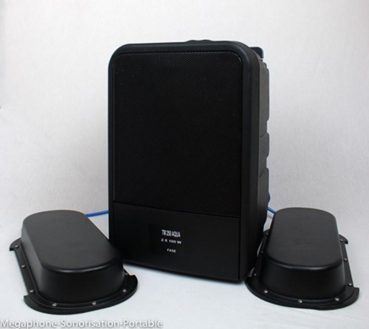 Cette sonorisation aquatique permet de diffuser simultanément du son sous l'eau et dans l'air.