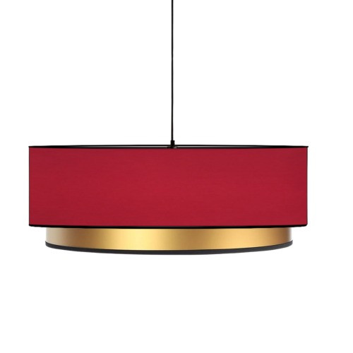 La suspension est dotée d'un double cylindre en coton, disponible dans une variété de couleurs au choix, et d'un abat-jour en or, souligné par un fin bordage de couleur également personnalisable.