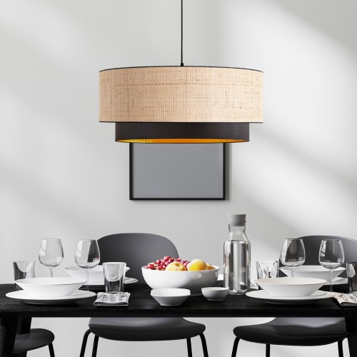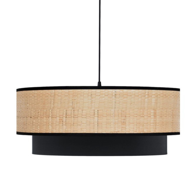 L'association du raphia naturel, du coton et du bordage noir crée un contraste visuel subtil qui attire l'œil et fait de cette suspension un élément de décoration à part entière.