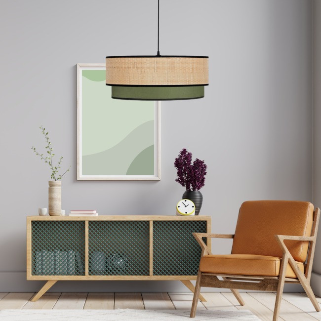 Cette suspension bi-matière crée un éclairage apaisant grâce à la combinaison du raphia et du coton.