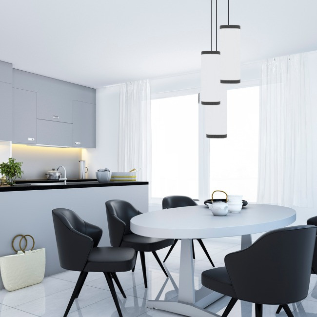 Ces suspensions en coton blanc avec finition noire sont des luminaires polyvalents qui apportent une touche d'élégance à n'importe quel espace.