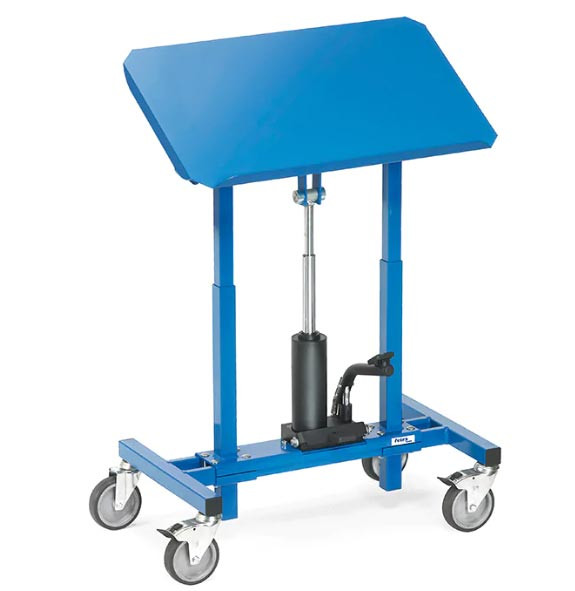 Hauteur réglable (même chargé) par pompe hydraulique, montée par pédale, descente précise par molette. |