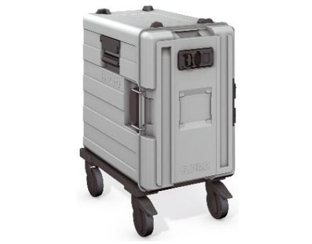 Protection contre les projections d'eau IPX 4 Contrôlé VDE-GS Caisson de transport de repas mobile recyclable Affichage d'état de fonctionnement Chauffage avec protection intégrée contre la surchauffe Charnière de porte brevetée (dégondable uniquement dans une position bien définie) Poignée encastrée en haut à gauche dans la porte pour un transfert aisé et une manipulation optimale du caisson