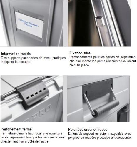 Conçu pour accueillir 3 bacs GN 1/1 de 150 mm de profondeur ou leurs divisions, ce conteneur est équipé de 12 paires de glissières moulées à un espacement standard de 39 mm.
