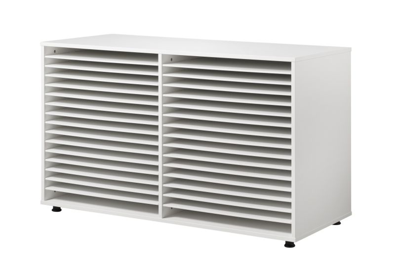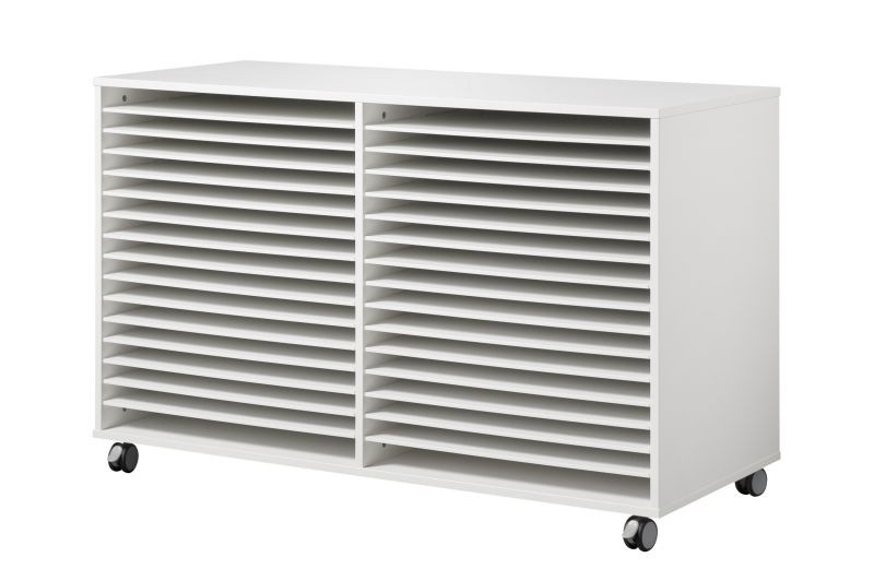 Sa capacité de 30 tablettes offre un rangement individuel pour chaque dessin, permettant une conservation optimale et un accès facile pour le personnel éducatif et les enfants.