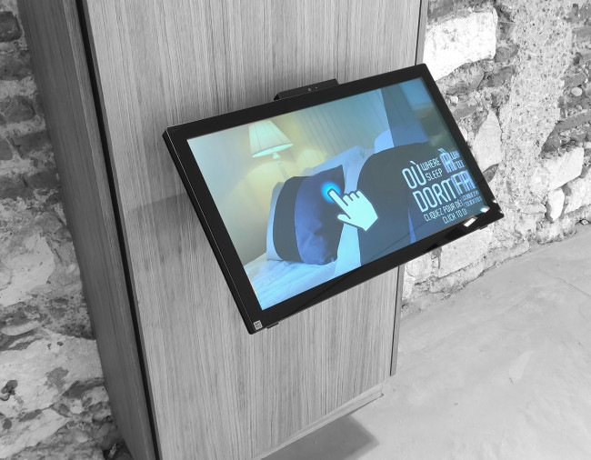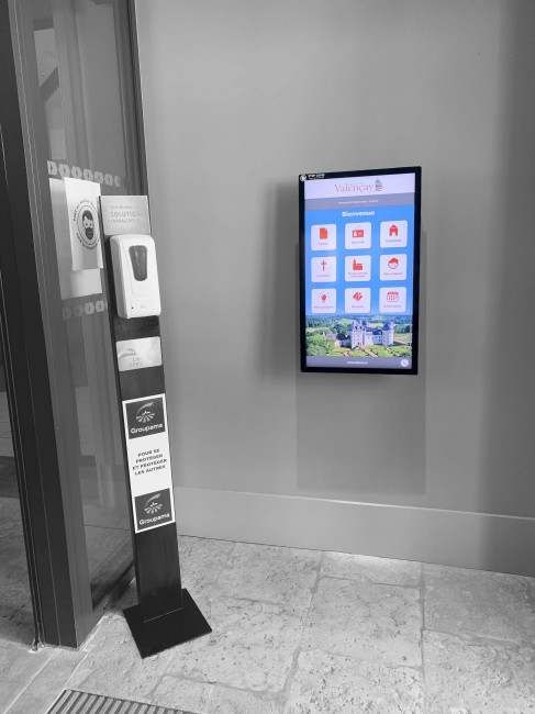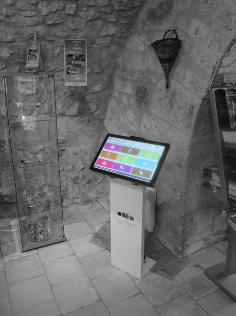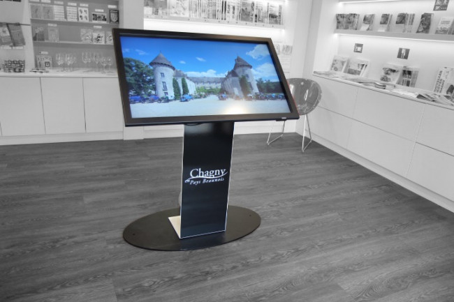 Nos bornes intérieures s’adaptent parfaitement à tous vos espaces d’accueil. Elles sont disponibles en 7 tailles, portrait ou paysage, voire table tactile pour les plus grandes. Elles peuvent être présentées sur pied personnalisable ou directement intégrées à vos meubles.