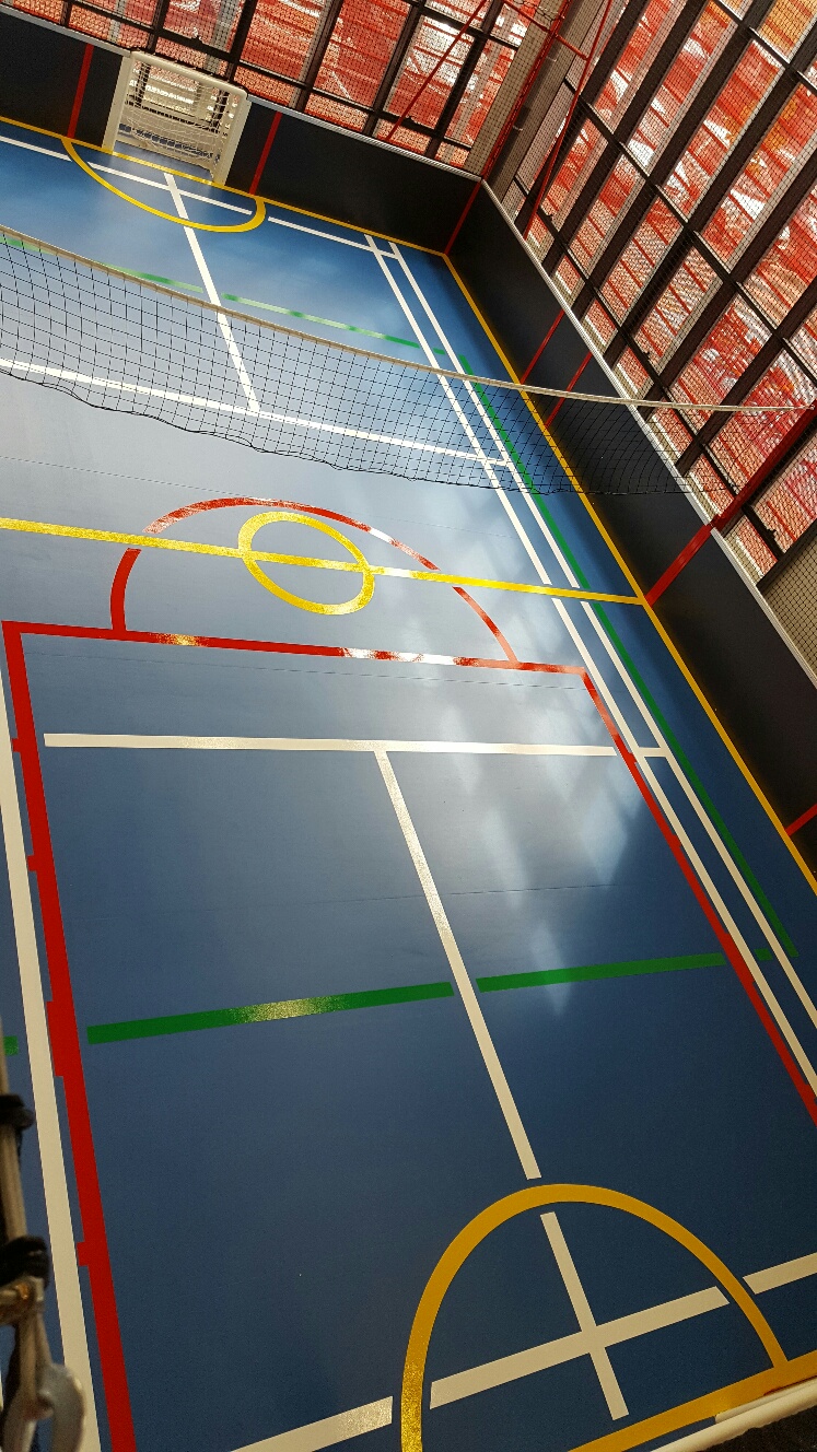 14/04/2025Traçage des lignes de terrains de Volley ball sur un revêtement taraflex de gymnase. cordialement.
