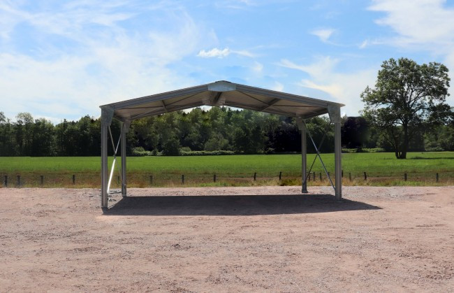 Je souhaite installer un abri pour mon camping-car (toit seulement) dans des dimensions qui seraient idéalement de 4 mètres minima en largeur (à l’intérieur des poteaux), entre 7 à 8 mètres de long et 3,50m de hauteur (toit une ou deux pentes).