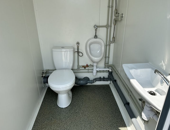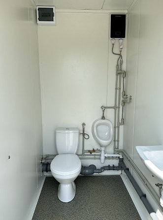 Polyvalent et Complet : Offre une solution tout-en-un avec des cabines pour toilettes, douche, et urinoir, ainsi qu'une chaudière pour l'eau chaude.