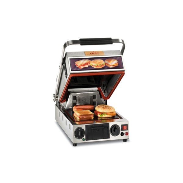 Il contient une enceinte fermée et des plaques vitro, ce qui le rend plus polyvalent, plus rapide, plus économique avec moins de fumées qu'un four et qu'un presse-sandwich classiques.