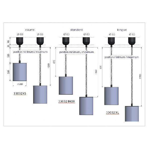 Cette lampe chauffante est disponible en 3 longueurs : 600 à 1300 mm, de 800 à 1800 mm et de 1200 à 2100 mm.