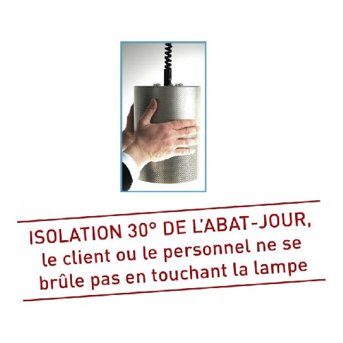 Le client ou le personnel ne se brûlera pas en touchant la lampe même après plusieurs heures de fonctionnement en continu grâce à son isolation 30°C de l'abat-jour.