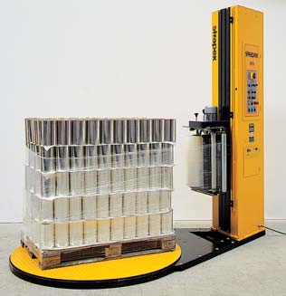 Machine à banderoler Banderolage manuel à l’aide de boutons poussoirs Banderolage automatique, 2 programmes Sélecteur pour le nombre de tours haut et bas sur la palette (de 1 à 3 tours) Hauteur de banderolage maximum de 2100 mm Détection du sommet de la charge par cellule photoélectrique Plusieurs diametre de plateau, plateau simple ou évidé Arrêt pour chargement et déchargement à + 90° Poids palette maximum de 1500 Kg Blocage de la table par frein moteur Rotation de la table à vitesse variable Vitesse variable pour le chariot porte bobine Frein bobine électromagnétique Pilotage par module programmable Siemens, type LOGO Diamètre maximum de la bobine, 250 mm Alimentation 220 V mono, puissance 0,75 Kw Poids machine 250 Kg Normes GS / CE Machine livrée avec mode d’emploi et certificat CE EN OPTIONS :