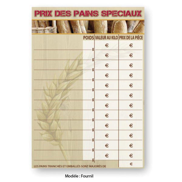 Réf. TC : 397973178Panneau prix pour pain Fournil 30 x 40 Prix des pains spéciaux A l'unité